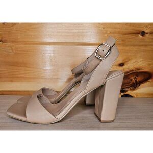 The A New Day Adro2 Sal Tan Heel Sandals are stylish and comfortable women's shoes in size 10. These ultra high heel sandals feature a square toe shape, a buckle closure, and a strappy design with eyelet accents. The Memory Foam insole provides added comfort, making them suitable for various occasions such as travel, parties, formal events, workwear, and business meetings. The faux leather lining and upper material, along with a solid black color, make these sandals a versatile and chic addition to any wardrobe. Perfect for any season, these sandals are designed for the modern woman on the go.Dents on both heels marks on bottom