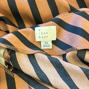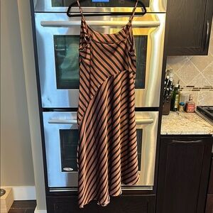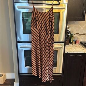 This elegant sundress by A New Day features a chic asymmetrical design with spaghetti straps, perfect for a cocktail evening. The rich brown and tan colors add a touch of sophistication, while the sleeveless style and flowing silhouette offer a graceful and flattering fit. Worn one time!