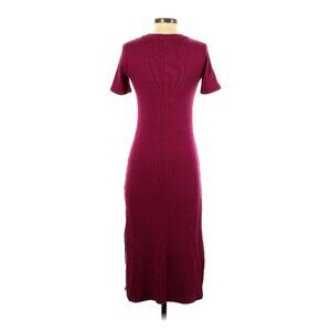 A New Day berry/wine/burgundy colored midi t-shirt dress, reaching mid-shin. Short sleeves. Crew neck. Small slit along sides.
