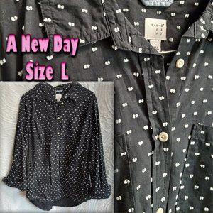 A New Day Black Button Down Shirt Top With Swiss Dots Size Large (T-203)