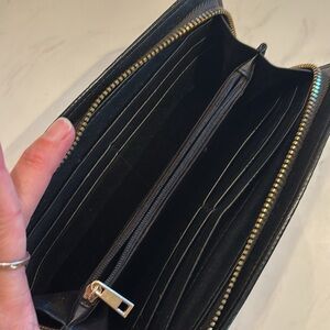 Chic black wallet with textured design. Ideal for everyday elegance. Aprox 8.25 wide by 4.25 tall. Gold hardware