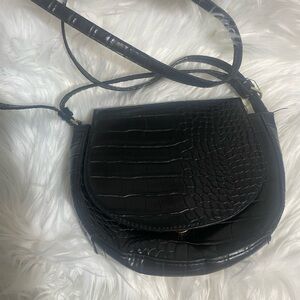 This chic crossbody bag from A New Day features a luxurious crocodile-embossed texture in a sleek black finish. Its saddle-style shape and adjustable strap make it a versatile accessory for any occasion. The glossy sheen adds a touch of elegance to its modern design.
