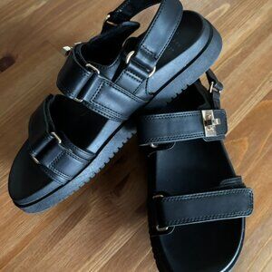 A New Day Black Platform Sandals with Velcro Strap and Gold Clasps | Size 7