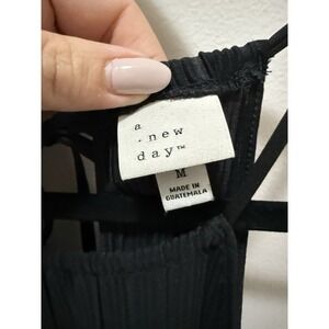 Chic and versatile black pleated midi dress by A New Day. Designed in a halter neck style with thin straps and a tie-back closure, this dress is crafted from lightweight, flowy fabric with a subtle vertical pleated texture. Perfect for dressing up with heels and statement jewelry, or wearing casually with sandals and a denim jacket.