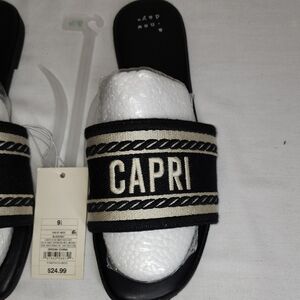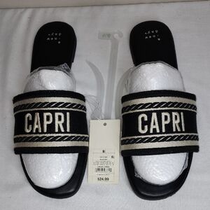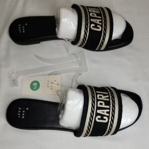 Step into comfort and style with A New Day's Black and Cream Slide Sandals. These sandals feature a sporty design with a wide strap for a secure fit, perfect for casual summer outings. The flat sole ensures all-day comfort, making them ideal for beach or poolside relaxation.