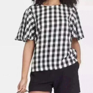 A New Day Black and White Buffalo Plaid Flutter Sleeve Top Size Large NWT