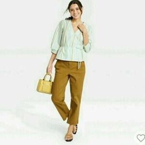 A New Day Blouse Green Striped Medium 3/4 Sleeve Wrap V Neck Peasant Boho