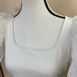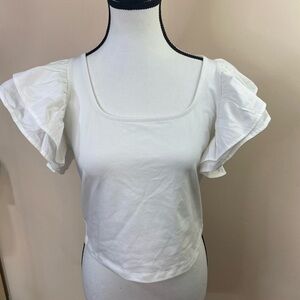 A new day boho inspired top. This is NWT size small. Made of 100% cotton and ultra soft, soft white color. The sleeves are two layers of ruffle that give some volume and interest.