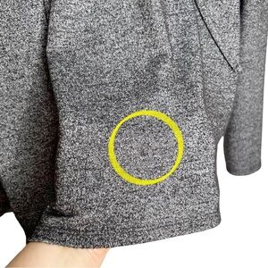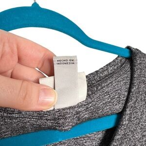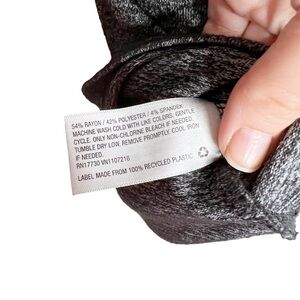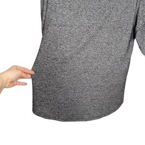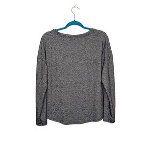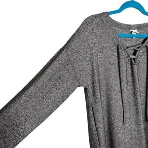 A New Day Charcoal Heather Gray Lace Up Neckline Blouse. Size medium. In good preowned condition: there is a factory made darker spot at front. Soft and stretchy rayon/polyester/spandex blend. Long sleeves. Rounded hem. Lace up neckline. Heathered gray color.