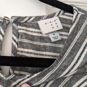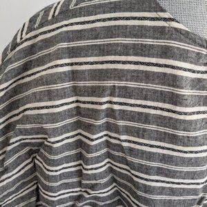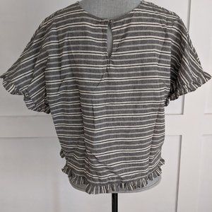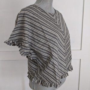 A New Day ivory, gray, and charcoal stripe blouse features an oversized wide raglan sleeve design with ruffles around the edges and a ruffled peplum waist. Material is 100% cotton. Can be styled for preppy, boho, or peasant styles!
