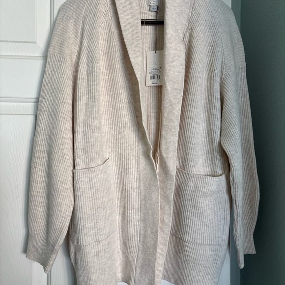 Elegant cream cardigan with ribbed texture. Open-front design. Features front pockets. Ideal for layering.