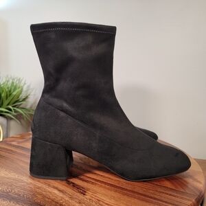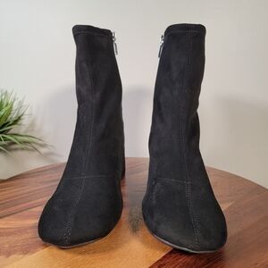 Black faux suede tall ankle boots. Wrapped blocks heels. Side zipper closures. Cushioned footbeds