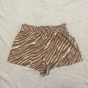A New Day Giraffe print shorts in size small made of linen blend material. The shorts feature a paperbag style with front pockets. The beige shorts are designed with an animal theme and giraffe print.