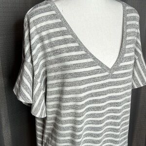 A New Day Gray White Striped Flowy V Neck Tee