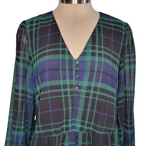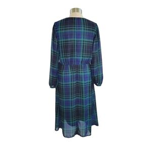 A New Day Green & Blue Tartan Plaid Long Sleeve V-Neck Midi Dress Women's Size S