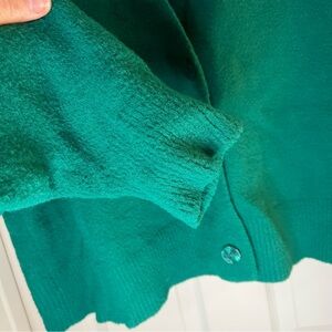 This emerald green cardigan showcases a chic V-neck design and long sleeves, perfect for layering. Its cropped length adds a contemporary flair, making it an ideal choice for any casual occasion.
