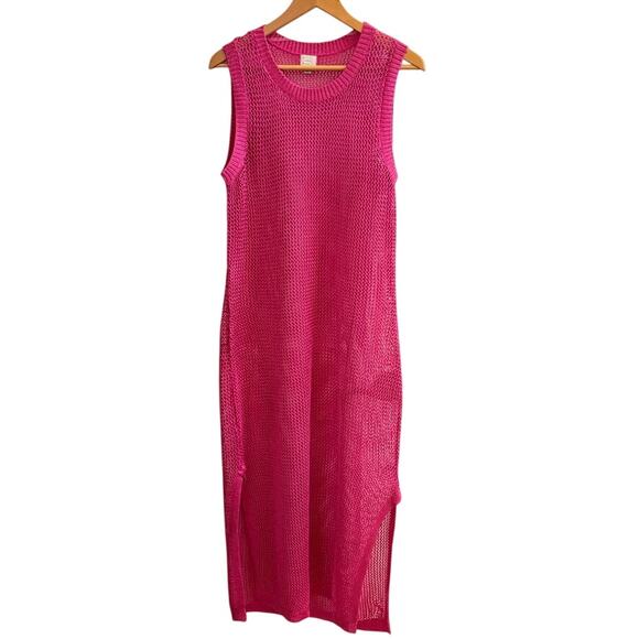 Bold hot pink sleeveless mesh knit cover-up dress from A New Day, featuring a metallic shimmer thread and side slits. Perfect for layering over swimsuits or styling for warm-weather vacations. Lightweight, stretchy, and modern resortwear vibe.