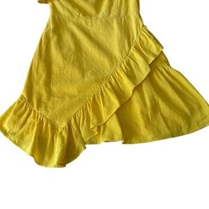 Step out in style with this vibrant yellow one-shoulder dress. Perfect for any occasion, its ruffled design adds a touch of elegance. A must-have addition to your wardrobe. Linen blend.