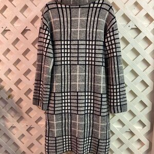 The plaids on this Coatigan are black, white and gray. Perfect with dress or jeans!