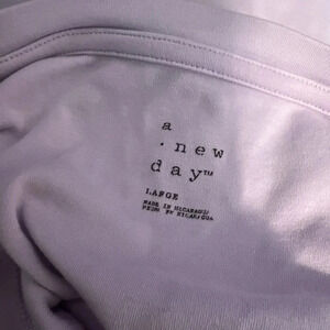 This A New Day Lavender Cropped T Shirt in size L is perfect for a casual occasion. The solid pattern, short sleeves, and round neckline make it a comfortable and stylish choice. The pullover closure and relaxed fit add to its ease of wear. Made of 100% cotton knit fabric, this shirt is machine washable and easy to care for. It features a front pocket, collarless design, and is unlined, making it perfect for summer and spring. The shirt is purple in color and has a cropped style.