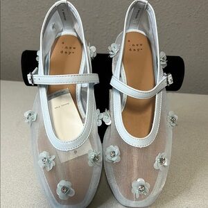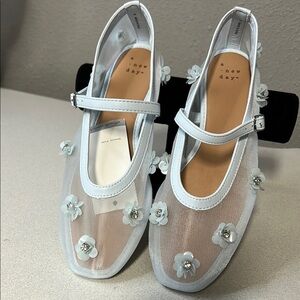 Chic sheer flats with floral details. Features a secure Mary Jane strap. Ideal for a stylish touch.
