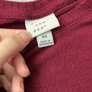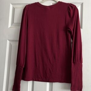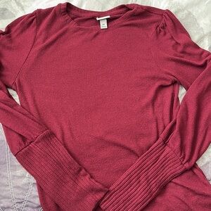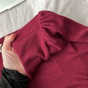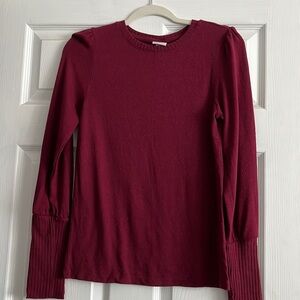 This sweater is in good condition. Minor pilling. Pleaded shoulders. Very flattering. See try on photos! Maroon color-may not show well in photos.