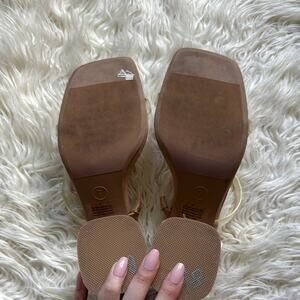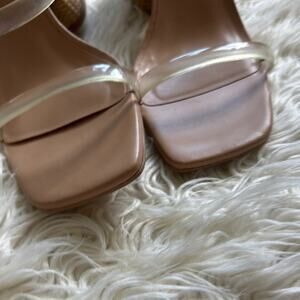Features: Slip on strappy pump sandle, heel is a natural weave style. Square toe. 3.5” heel.