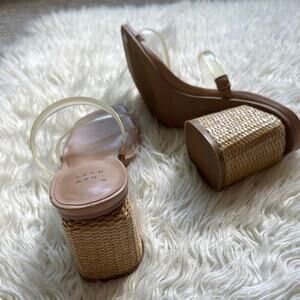 Features: Slip on strappy pump sandle, heel is a natural weave style. Square toe. 3.5” heel.