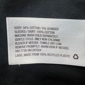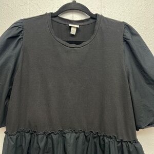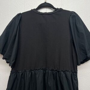A New Day women's pullover black dress. Round neck. Pleated shoulders. Short wide sleeves. Ruffled waistline. Side pockets. Knee length depending on height. In good used condition. No stains, tears or holes.