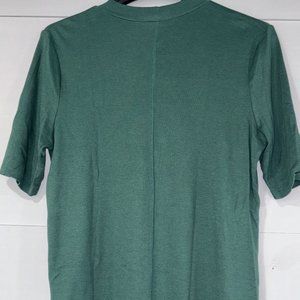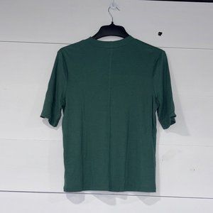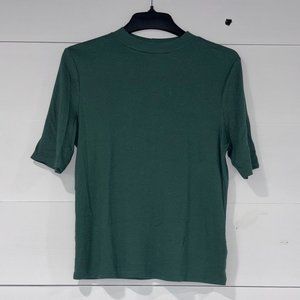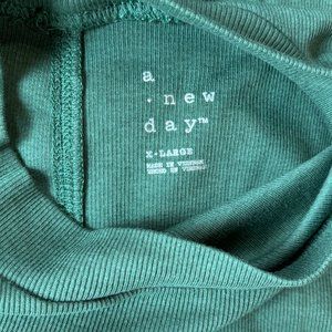 A New Day Mock Neck Ribbed Fitted Top Short Sleeves. Size X-Large in a beautiful Mossy Green. In great used condition. Soft, stretchy top with a seam down the back.