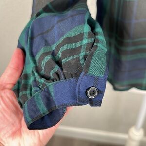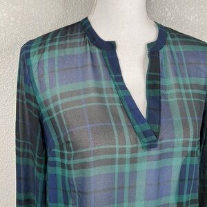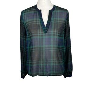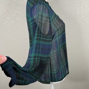 A New Day Navy & Green Plaid Sheer V-Neck Long Sleeve High Low Top Size Small