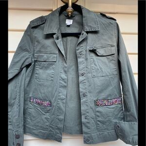 A New Day olive long sleeve denim jacket, decorated with colorful beads pockets, Two pockets on the chest and 2 pockets at the bottom. Double metal snap buttons on the wrists; lapels. Gently used, great condition.