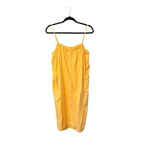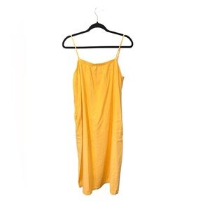 Lightweight orange midi dress with adjustable straps, elastic top, and pockets. Worn once, small spot shown in photos.