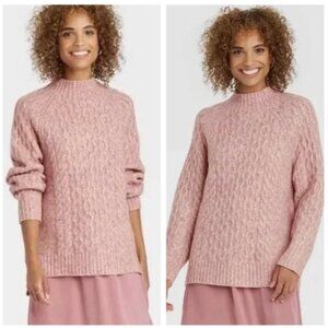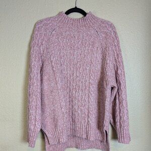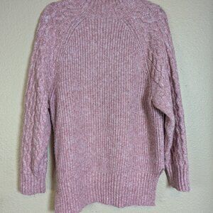 Heather pink chunky cable knit pullover sweater. Oversize fit, mock neck, tunic length, long sleeve. Acrylic/polyester/wool blend.