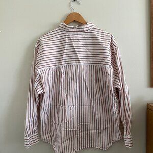 Oversized striped button down. Stripes are light brown/burnt orange and mauve / dusty pink. Light weight shirt, great for layering.