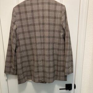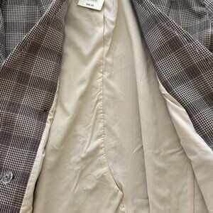 A New Day Plaid Double Breasted Boxy Fit Blazer. Fully lined. Size Medium. New with tags. Boxy/relaxed fit, structured shoulders, and a neutral plaid pattern in brown/cream/black tones. Front flap pockets and notched labels. Fabric content: Shell 63% recycled polyester, 33% rayon, 4% spandex. Lining 100% recycled polyester. Approx. measurements: pit to pit 20", shoulder to bottom 30", sleeves shoulder to cuff 24".