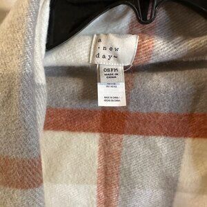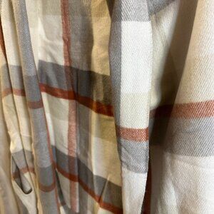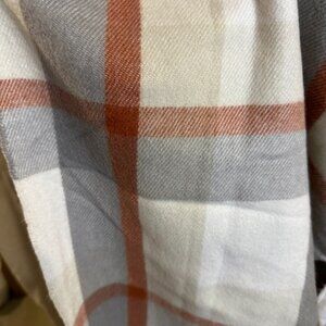 Cozy and stylish plaid wrap by Target’s A New Day. Features soft brushed fabric in cream, gray, and rust-orange tones with subtle fringe edges and arm slits for easy wear. Perfect layering piece for fall and winter.