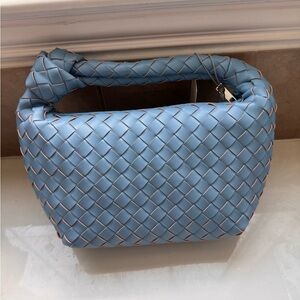 Stylish sky blue woven mini bag. Perfect for adding a touch of elegance.