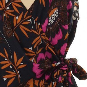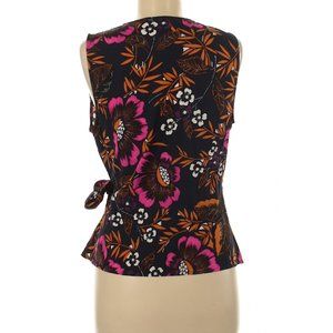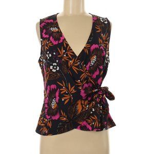 V-neck, sleeveless blouse. Tags removed but never worn or washed. Navy blue background with floral tropical print. Wrap style with side tie.