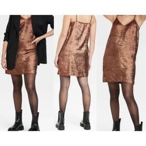 This A New Day slip mini dress from Target is crafted in shimmering crushed velvet with a copper bronze metallic finish. Designed with a v-neckline, adjustable spaghetti straps, and a chic shift silhouette, it’s perfect for parties, cocktails, or festive holiday gatherings. A glamorous and versatile piece that adds shine to any occasion.