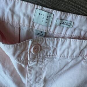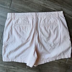 Classic and versatile, these chino shorts come in a soft light pink shade with a flattering mid-rise fit. Designed with stretch fabric for comfort, they feature front slant pockets, belt loops, and buttoned welt pockets at the back for a polished look. Perfect for casual days, vacations, or pairing with your favorite blouse or tee for an easy, stylish outfit. Size 14, like new.