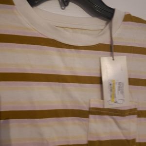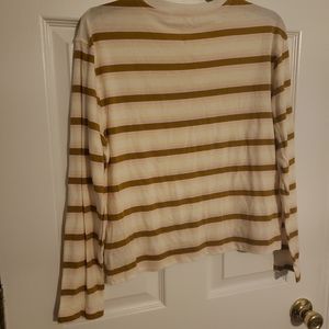 Cream long sleeve shirt with pink, brown and yellow horizontal stripes.