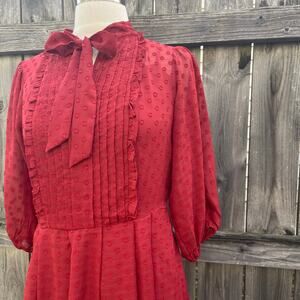 Features: Ruby red long sleeve dress, tie neck, pleated bust, swiss dot overall pattern, elastic sleeve cuffs, lined