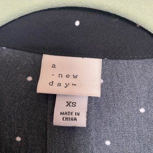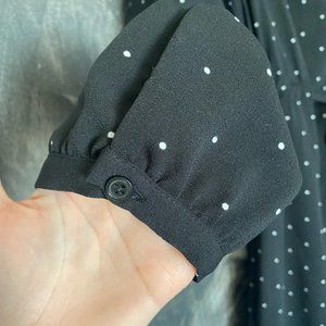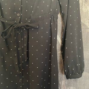 Cute black shirt dress from Target (A New Day) with white polka dots! Dress cinches/ties at the waist, buttons up, and has buttons on the shirt cuffs. I wore this dress once to an interview and just never grabbed for it again. In great condition!
