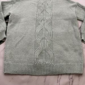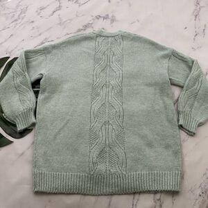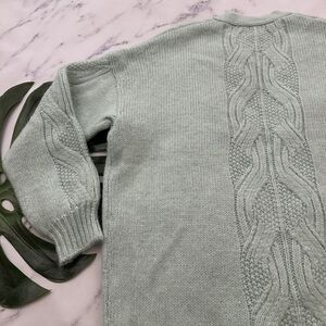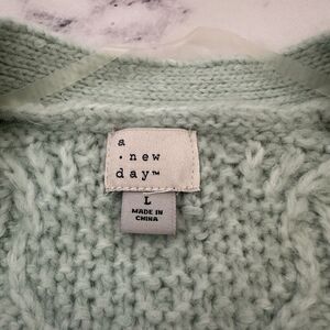 A New Day Target women's mint green cable knit chunky cardigan sweater, size L. It is free from any rips or stains. It measures about 52 inches around the bust and is about 33 inches long.