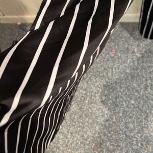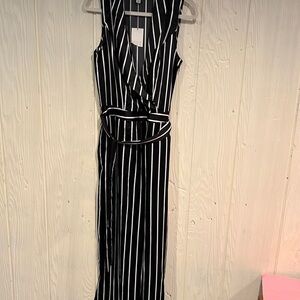 A New Day wide leg jumpsuit in size medium. Features a black and white striped pattern, sleeveless design, collared neckline, and a matching belt. The ankles have slit details. The material has a silky feel.