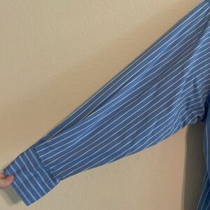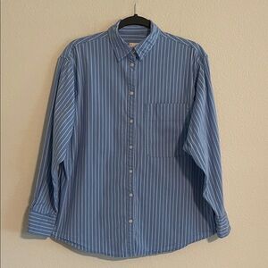 Stylish blue striped shirt. Button-down design. Ideal for casual or formal wear.