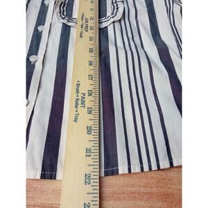 It is made of light fabric with a vertical striped pattern in navy blue and white tones, which helps to stylize the figure visually. It has buttons in front, a small decorative pocket on the chest a casual touch, and wide butterfly-type sleeves. Used once in excellent condition.