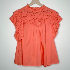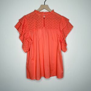 A New Day‎ Womens Blouse XL Orange Coral Eyelet Sheer Light Ruffle Summer Boho