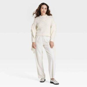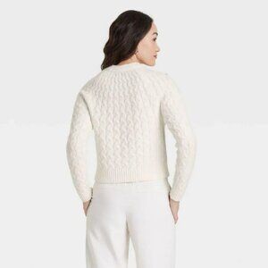 Stay cozy and stylish with this A New Day Women’s Cable Knit Pullover Sweater in cream, designed in size XXL for a relaxed and comfortable fit. Crafted from a heavyweight recycled polyester blend with spandex, this sweater provides warmth without sacrificing style, making it perfect for chilly days and nights.